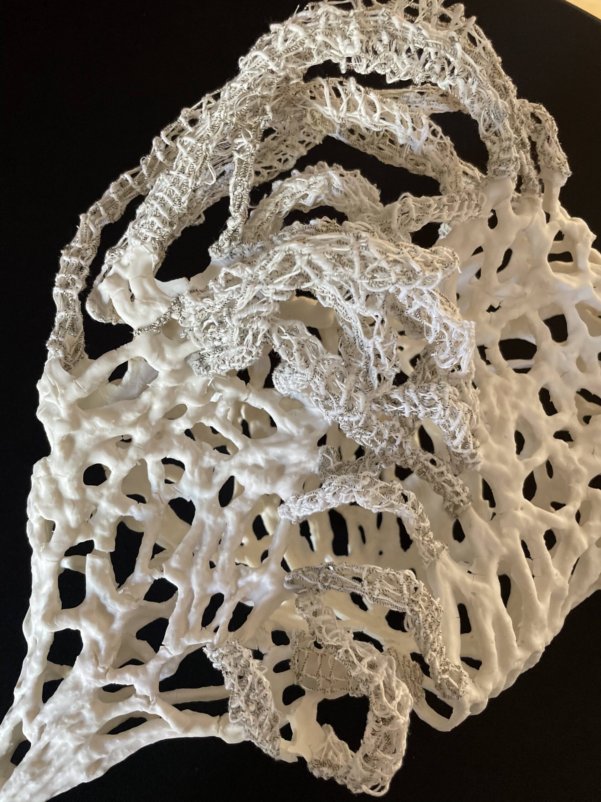 Het kantklossen dat aan de basis ligt van haar oeuvre mag als techniek dan historisch gezien niet zo oud zijn, toch voelt het aan alsof het dieper en verder geworteld is, als een haast natuurlijke beweging. Zelfs in haar ‘versteende’ kant, waarin ze kantklossen en keramiek tot één object verweeft, laat het verbrande weefsel bij het bakken een spoor na, zichtbaar wanneer je het werk tegen het licht houdt.