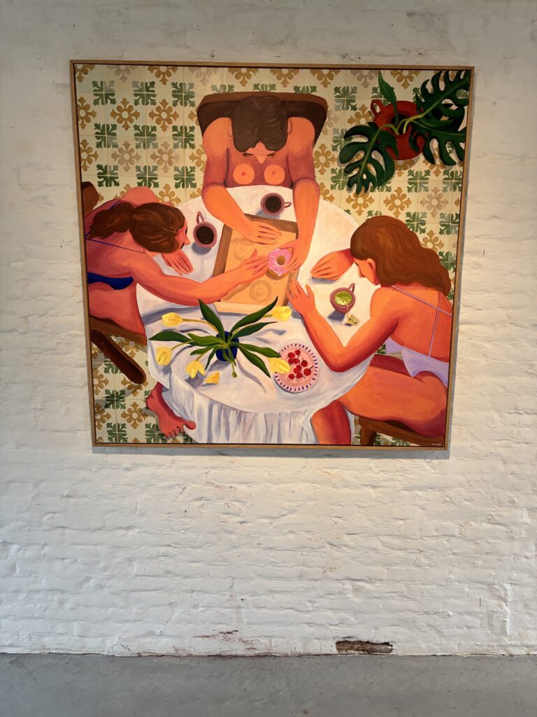 Het is dat spanningsveld dat Vanessa onderzoekt, al lijkt het soms een speelveld, te oordelen naar haar soms luchtige aanpak van het thema. Soms subtiel, wanneer drie vrouwen aarzelen om de laatste doughnut op te eisen, nagenoeg klaar om ervoor te vechten, of wanneer ze ’s nachts in verschillende poses nadenken over hun afgemeten imago. Soms ligt het in de symboliek, zoals wanneer een vrouw in een doorschijnende jurk lipstick aanbrengt bij een andere vrouw in een soort baljurk – je kan er lang over doormijmeren. Steeds vrouwen, al zijn ze lang niet de enigen die te lijden hebben onder de druk van sociale conventies – zo getuigt toch de body count die hier in handen is van een vrouw, en waar een spiegel wordt voorgehouden aan de vreemde gewoonte van (niet alle) mannen om lijstjes bij te houden van hun veroveringen, vrouwen als verzamelobject; ‘geobjectiveerd’ heet dat zo mooi in hedendaagse termen. Maar zijn vrouwen niet in zekere zin schuldig aan dit objectiveren, lijkt Vanessa zich af te vragen, door zichzelf te behandelen als een beweegbaar begrip dat aan bepaalde standaarden kan voldoen? Het is misschien ook onafwendbaar, gezien de onwrikbare tradities die met die handelingen gepaard gaan, en soms generaties overspannen.