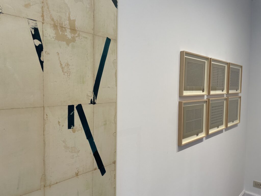 De Britse kunstenaar Sam Lock experimenteert voortdurend, speurt het effect na van verschillende combinaties materialen die elkaar dan eens aantrekken of afstoten, dwingt met impulsieve uithalen en toevallige handelingen de materie tot een staat van twijfel en onzekerheid, die niettemin een subtiel evenwicht bereiken op de doeken, ook al weet hij nooit op voorhand waar dit evenwicht zich zal bevinden. Het contrasteert op het eerste oog fel met de uiterste beheersing van Wim Nival, die met een intens monnikenwerk naar een resultaat toewerkt, strak en beheerst weghaalt in patronen die gelijkenissen vertonen zonder zich ooit te herhalen, en zijn werken in een strakke maar nooit vervelende compositie ensceneert.
